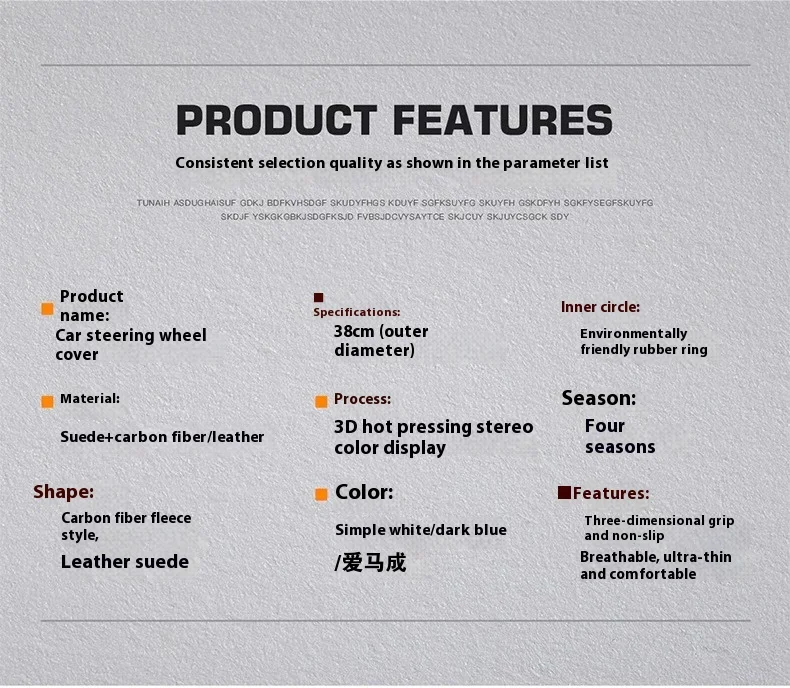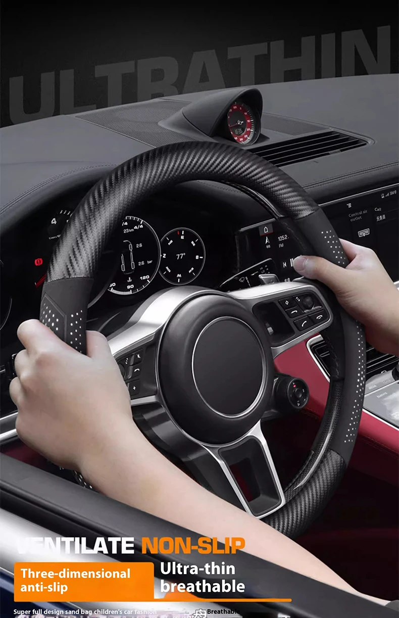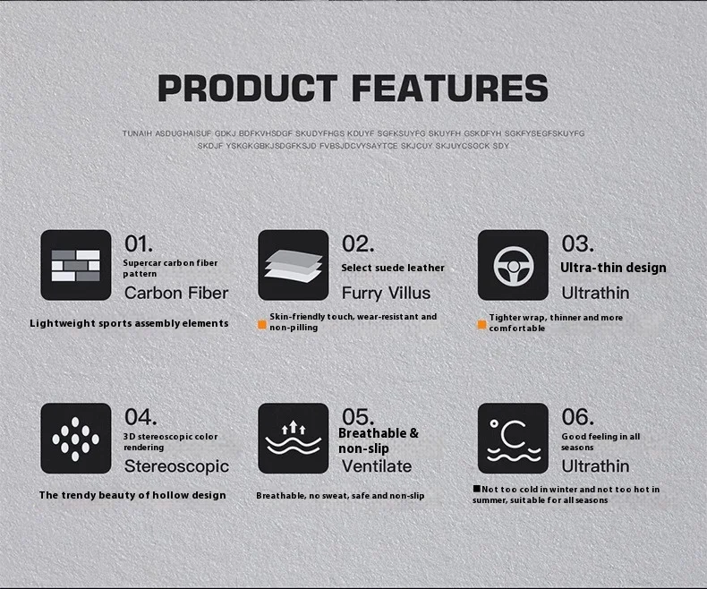 2. Features: Carbon fiber+Suede, the same material as the sports car, metal logo, first layer cowhide, no peculiar smell; non-slip silicone, noble appearance; wear-resistant - cold resistance, cold resistance, sweat absorption, breathability, wrinkle resistance, soft texture.. ..